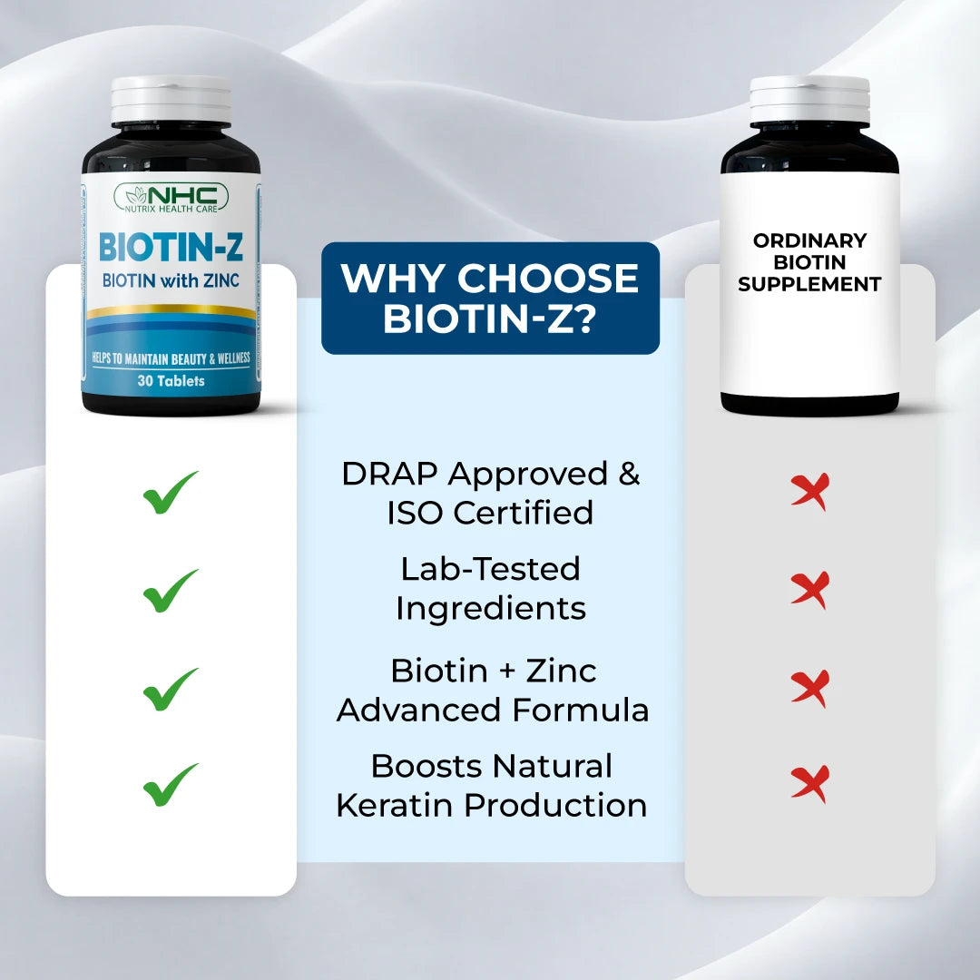 Biotin-Z regular use se hair shine improve hui, nails strong hui aur skin zyada healthy aur glowing lagti hai.